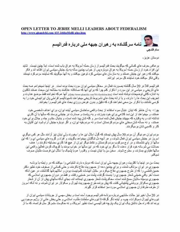 Letter to Jebhe Melli Leaders about Federalism